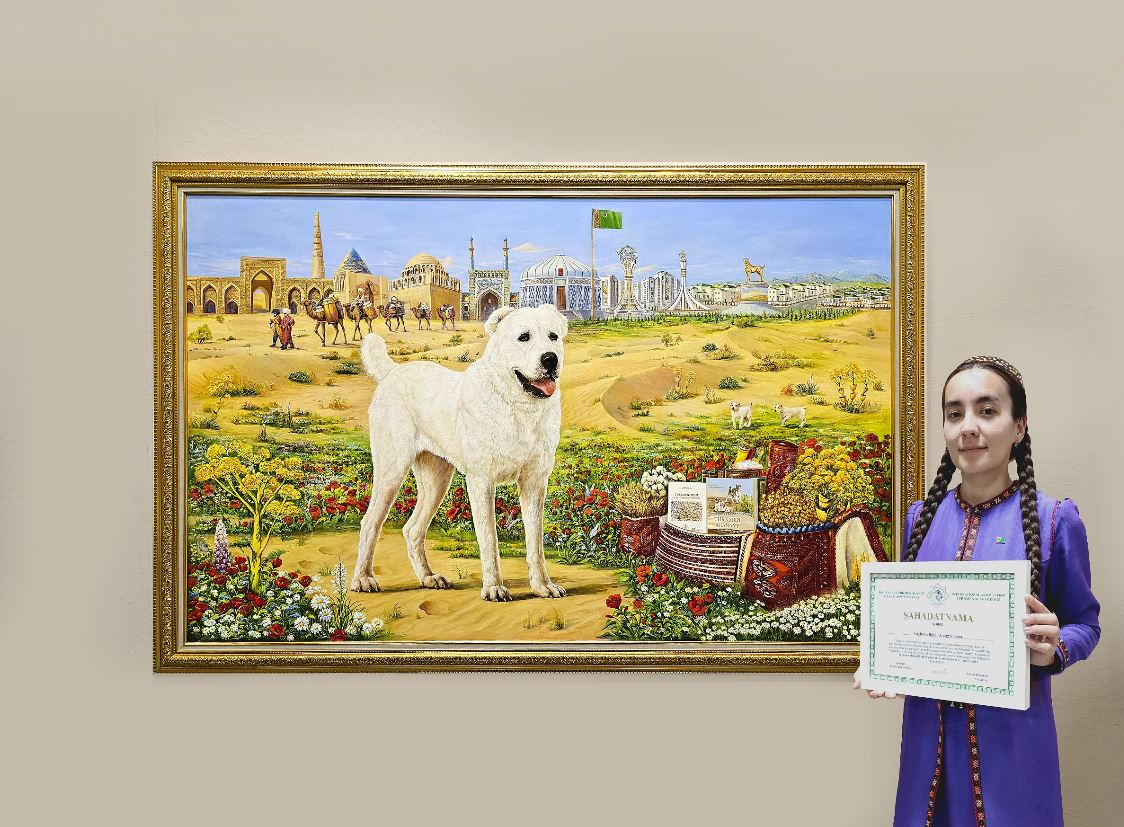 Особенно радует, что среди победителей творческого конкурса оказались студентки факультета изобразительного искусства Государственной академии художеств Туркменистана Бягуль Артыкова и Сельби Джумадурдыева. В картине Бягуль Артыковой «Радость туркмен – гордость веков» раскрываются исторические корни, способности, уникальные черты и особенности туркменских алабаев, уходящих вглубь веков. Изумительный пейзаж отображает растительный мир туркменской степи, средневековые памятники и современную архитектуру Ашхабада, караван верблюдов, олицетворяющих Великий Шёлковый путь, который проходил через Туркменистан. «Год «Счастливая молодёжь с Аркадаг Сердаром» навсегда оставит в моей памяти неизгладимые впечатления, так как в этом году от имени руководства страны я была награждена сертификатом и памятными подарками за живописное произведение, представленное на творческий конкурс, приуроченный к Празднику туркменского алабая. При воплощении художественного образа туркменского алабая, ставшего прекрасным примером верности, мужественности, храбрости, я изучила замечательные книги Героя-Аркадага, историю, повадки, отличительные черты этой древней породы собак, - говорит Бягуль Артыкова». Наставник Бягуль Артыковой заслуженный деятель искусств Туркменистана, старший преподаватель кафедры живописи Государственной академии художеств Туркменистана Аширмухаммет Кулиев смог передать свой опыт и знания молодой художнице, которая, как и он высоко ценят и воспевают культурное наследие нашей Родины.